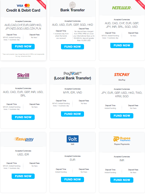 Con FP Markets es posible realizar ingresos en distintos medios, como tarjeta de crédito, Wire Transfer, E-Wallet o PayPal.