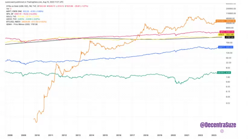 Durante el período que cubre la existencia del Bitcoin, 2008 – 2023, su crecimiento ha sido excepcional, como bien lo muestra en el siguiente gráfico de su autoría, Susie Violet Ward, analista de Forbes, quien compara la criptomoneda líder del mercado con un representativo grupo de los activos tradicionales como el oro, los bonos, las acciones de Microsoft y el S&P 500, todos de buen rendimiento durante ese marco temporal.