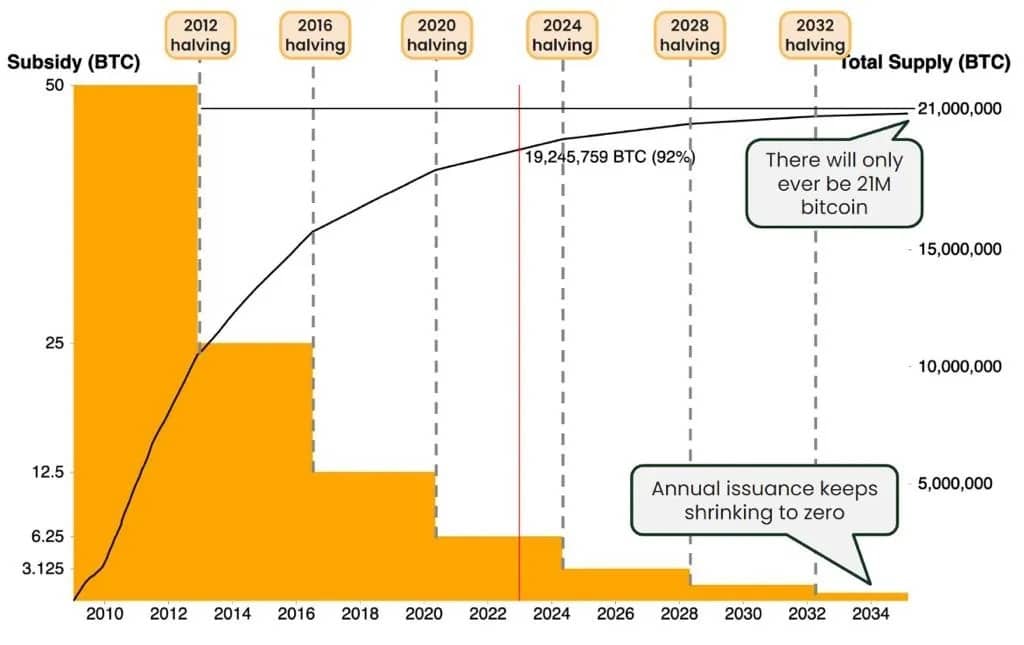 La oferta de Bitcoin tiene un límite de 21 millones de monedas y el mecanismo de halving está programado para que la cantidad de Bitcoins que se minan en cada bloque disminuya con el aumento de la cantidad de monedas circulantes, con lo cual las posibilidades de obtener Bitcoins se reducen con el tiempo y su valor tiende a aumentar por la escasez inducida.