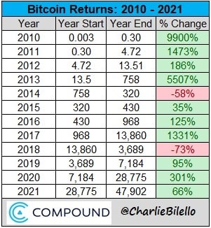 No hay activo que en rendimiento sobre la inversión pueda compararse, pues ello supone, tal como afirma CaseBitcoin en los tweets que acompañan el siguiente gráfico publicado en la red social, “5.2 millones porciento de retorno a lo largo de la década” y agrega …” esto significa que Bitcoin ha tenido una ganancia de casi el 200% (por lo que casi ha triplicado su dinero), cada año durante 10 años».