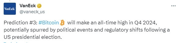La firma de activos VanEck sostiene que Bitcoin alcanzará un máximo histórico en el último trimestre de 2024, «potencialmente causado por acontecimientos políticos y cambios regulatorios tras unas elecciones presidenciales en EEUU».