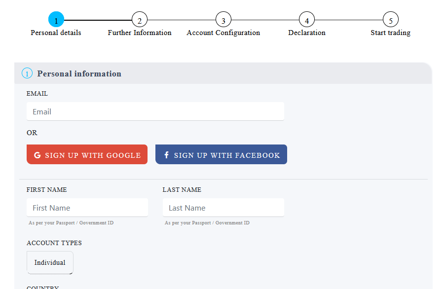 Si clicamos en la opción «Únase ahora», pasaremos a la pestaña del formulario de registro de FP Markets. Para darnos de alta en la plataforma, el proceso no toma más de 3 minutos. Además, FP Markets pone a disposición del usuario la posibilidad de registrarse a través de 3 métodos de registro: